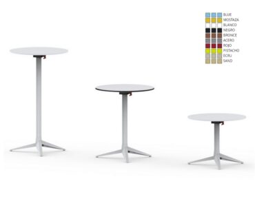 Mesa Faz 65 Vondom Contract, diseño Ramón Esteve. Tubo de aluminio extrusionado con base de fundición de aluminio pintado con pintura epoxi al horno varios colores a elegir. Apto para uso interior y exterior. Disponible con tres o cuatro pies. Tablero HPL blanco o negro o blanco o borde blanco o cristal transparente. Opción de estructura abatible.