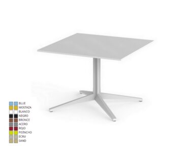 Mesa Faz 96 Vondom Contract, diseño Ramón Esteve. Tubo de aluminio extrusionado con base de fundición de aluminio pintado con pintura epoxi al horno varios colores a elegir. Apto para uso interior y exterior. Disponible con tres o cuatro pies. Tablero HPL blanco o negro o blanco o borde blanco.