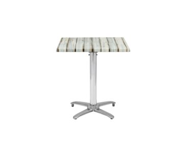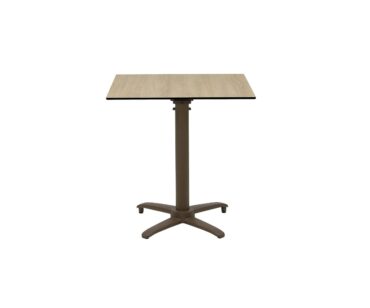 Mesa con estructura fabricada en aluminio pintada con tablero abatible en forma vertical que hace muy sencilla la recogida. Diferentes tableros a elegir como: Compacto, TOP o melamina (para uso interior). Sus patas pueden ser en grafito, óxido marrón o aluminio pulido. Esta mesa se puede elegir con altura estándar o altura de 110cm.