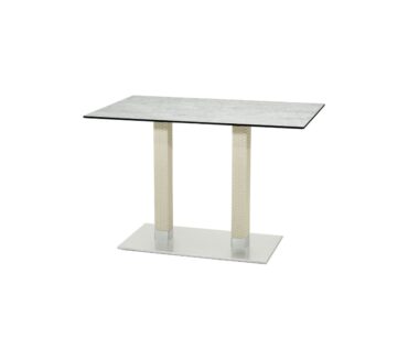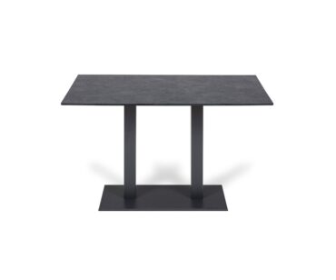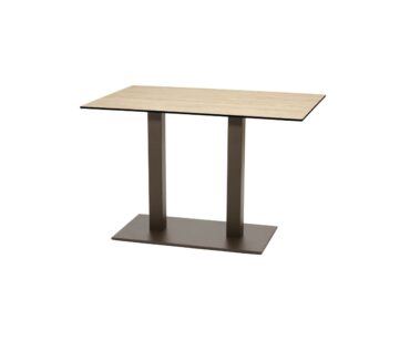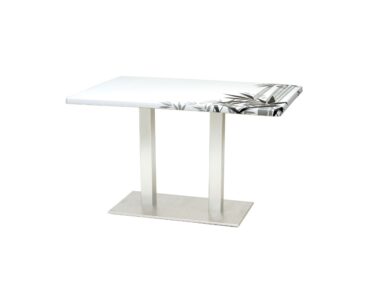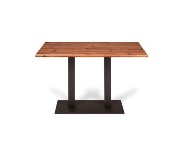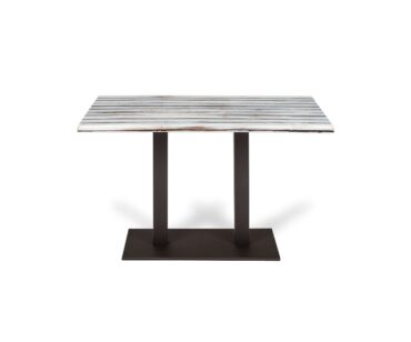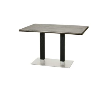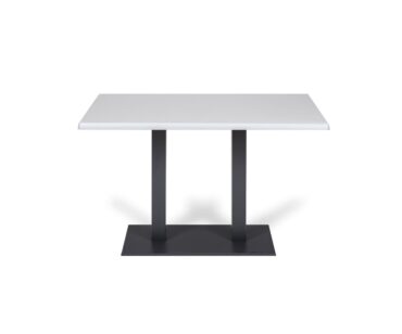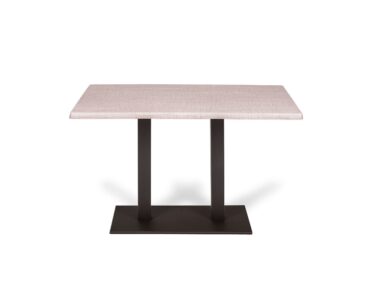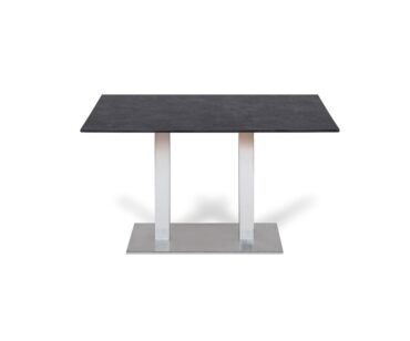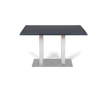 Mesa con pie central fabricado en aluminio con base cuadrada reforzada con una plancha de acero de 7mm que aporta una mayor superficie de apoyo y peso. Disponible con estructura pintada, deco-inox o con columna trenzada. Tableros disponibles en TOP, Compacto, melamina y madera (uso interior).