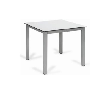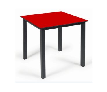 Mesa hostelería 25-677 con tubo de aluminio de 4,8×4,8 cm. Acabado en color grafito negro, deco inox y blanco. Tapa de compact disponible en gran variedad de acabados, acabado solo y melamina regruesado, Válida tanto para interior como para exterior. Apilable en las medias cuadradas. Medidas disponibles: 70×70 / 80×80 / 110×70 / 120×80.