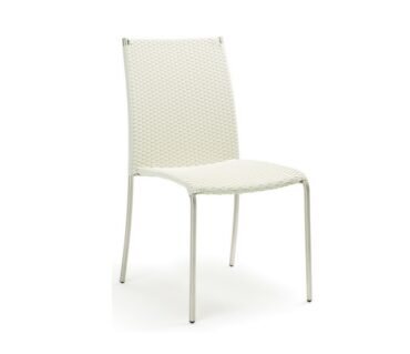 Silla 25-4519 con estructura de acero inoxidable y cubierta de médula plastificada trenzada a mano. Disponible en blanco. Apilable. Válida tanto para interior como para exterior.