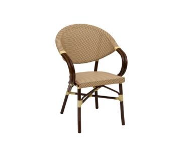 Sillón fabricado en aluminio, apto para su uso exterior, con decorado nogal y bambú y estilo vanguardista. Respaldo curvo que rodea tu espalda con un textilene firme. Es un sillón amplio y resistente.