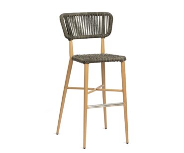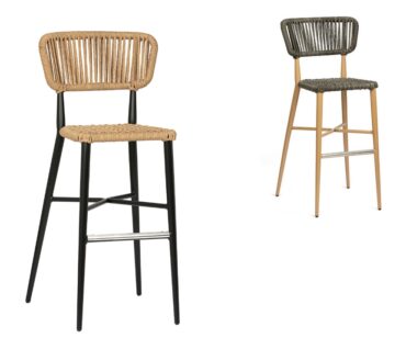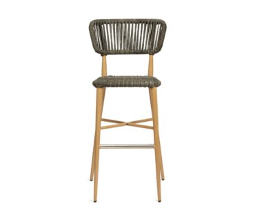 Taburete hostelería 25-3200, un toque oriental para tú terraza o restaurante, estructura de aluminio pintada deco Roble Natural o negro y con asiento y respaldo en cuerda gris o crema. Mobiliario preparado para uso exterior. Permite ser apilable, lo que la convierte en un modelo perfecto para espacios pequeños.