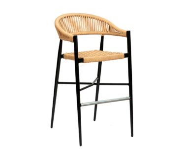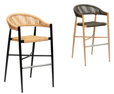 Taburete 25-3300 para hostelería y de gran diseño y confort. Estructura en aluminio pintado en deco roble natural con brazos o negro. Apto para exterior e interior, taburete apilable.