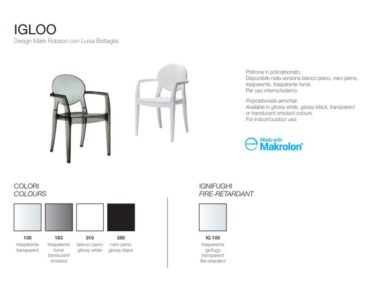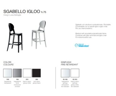 Taburete hostelería Igloo, diseño de Luisa Battaglia. Taburete con respaldo realizado en resistente policarbonato disponible en blanco y negro, tanto transparente, translúcido u opaco. Dos alturas disponibles: 65 y 75 cm. Apilable. También existe su versión en silla, en sillón, tanto en policarbonato como en tecnopolímero. Si lo que buscas es comodidad a la vez que estilo, no dejes escapar esta magnífica colección que, aunque aparentemente sencilla, está realizada con materiales de calidad, resistentes para espacios públicos y concurridos, además de tener estilo propio, será la elección perfecta sea cual sea su ubicación. Válido para exterior.