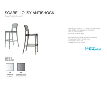 Taburete hostelería Isy, diseño de Roberto Semprini. Realizado en resistente policarbonato disponible en acabados transparentes ahumados. También existe la versión en tecnopolímero en varios tonos. Apilable. Si lo que buscas es originalidad y estilo, no dejes escapar esta magnífica colección que, aunque aparentemente sencilla, está realizada con materiales de calidad, resistentes para espacios públicos y concurridos, además de tener estilo propio, será la elección perfecta sea cual sea su ubicación. Completa esta fabulosa colección con la silla a juego. Válido para exterior.