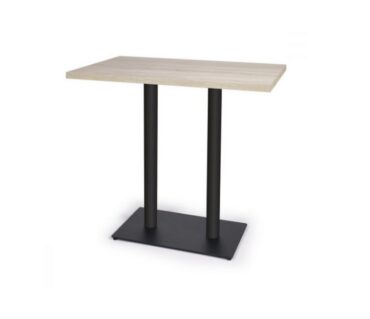 Mesa alta rectangular de hostelería 25-9222. Pie central con estructura de acero pintado en negro y blanco, columna redonda y base rectangular de 70x42cm, tapa de melamina regruesado, compact, acabado solo y melamina gama studio.
