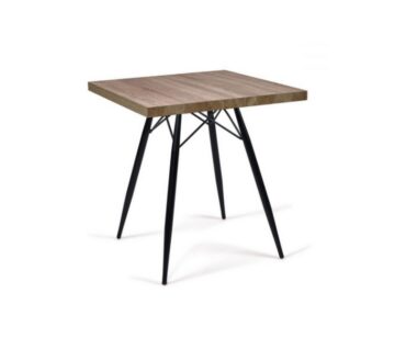 Mesa de hostelería 25-466 X-4. Original mesa de interior realizada con estructura de acero disponible en dos acabados: pintado negro o deco madera natural. Tapa de melamina, solo, compact, melamina gama studio, disponible en varias medidas y formas, tanto redonda como cuadrada.