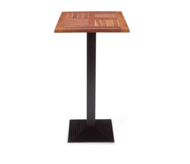 Mesa hostelería 25-7620 realizada en fundición de hierro con base de 42x42cm y columna de hierro o de madera color nogal, tableros de 60×60 y 70x70cm, disponibles en Melamina, Werzalit, Compacto.