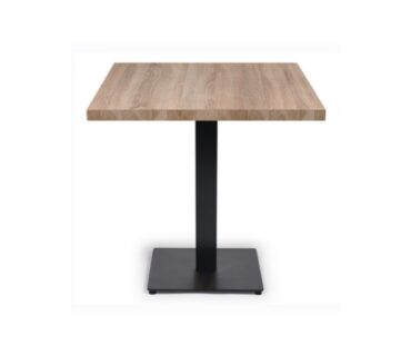 Mesa de hostelería 25-9102. Pie central con estructura de acero pintado en negro, columna y base cuadrada disponible en dos medidas: 42×42 y 52x52cm, tapa cuadrada de melamina regruesado, compact, solo y melamina gama studio.