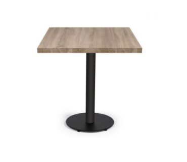 Mesa de hostelería 25-9201 con pie central y estructura de acero pintado en negro y blanco, columna y base redonda de 42cm, tapa cuadrada o redonda, con acabados en melamina regruesado, compact, solo y melamina gama studio.