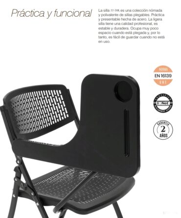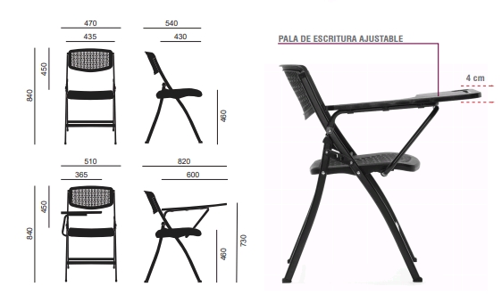 La versión con pala está disponible solo en color negro, la silla se entrega montada y siempre se vende en cajas de 4 unidades.