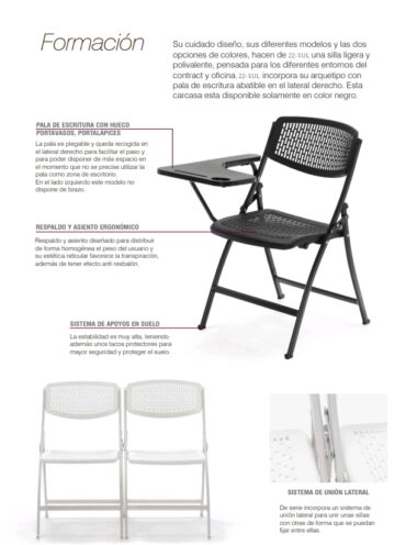 – Sistema de unión: De serie, incorpora un sistema de unión lateral para unir sillas, de forma que se puedan fijar entre ellas.