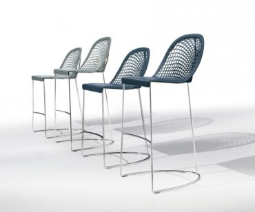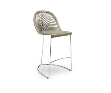 Taburete con patín y reposa-píes. Bastidor disponible en cromo o acero lacado. Shell en cuero.