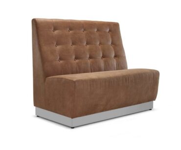 Sofá hostelería Los Ángeles Vintage. Sofá a medida de aire retro tapizado en un amplio abanico de posibilidades según muestrario; acabado con rodapié en madera de haya, roble, cebrano, laminado o inox. Completa esta magnífica colección con el puf a juego y haz que tu local esté en perfecta armonía.