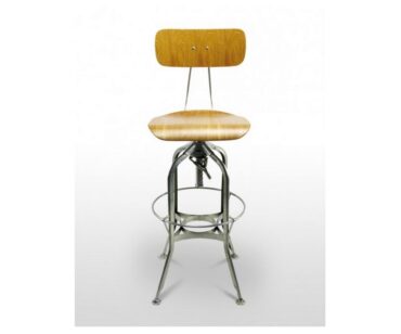 Taburete hostelería Bresden. Taburete giratorio y regulable en altura con estructura metálica, disponible en negro o gris metalizado (con suplemento). Asiento y respaldo de madera. Perfecto para espacios industriales, laboratorios, o bares/restaurantes que le darán un toque original y diferente.