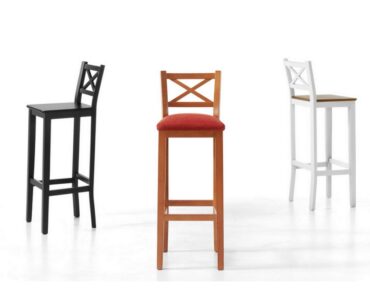 Taburete con chasis fabricado en madera de haya maciza reforzado con 4 escuadras de haya. Posibilidad de diferentes colores para la estructura según carta de colores y tapizados en telas y polipiel.